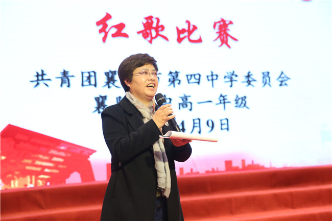 最后,四中校长李静老师对比赛做了精彩点评,她高度肯定了高一学子的歌唱水平和爱国激情。李校长给学生勾勒了党的百年奋斗历程,号召同学们不忘初心、牢记使命,永远跟党走。李校长还回忆了自己的青春岁月,说到动情处,即兴演唱了一曲《英雄赞歌》,引来阵阵喝彩,掀起新的高潮。红歌比赛在李校长的深情歌声中圆满结束。